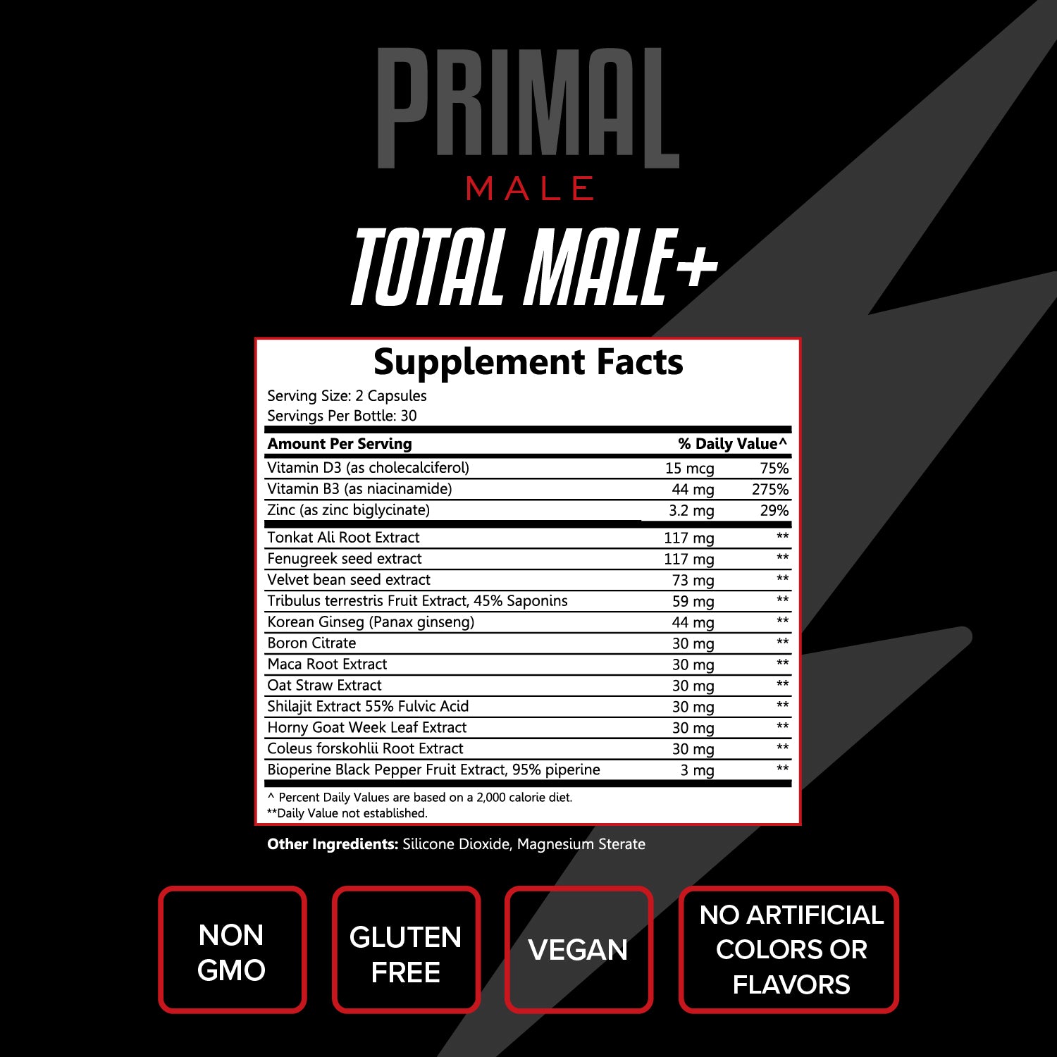 Primal Male Total Multivitamin Capsules are formulated with essential nutrients, including Vitamin D3 and B3, to help support daily energy, strength, and overall vitality. This comprehensive formula promotes stamina and endurance while helping the body manage stress and maintain mental focus. Designed to support hormonal balance, male reproductive health, and enhanced nutrient absorption, it helps optimize overall performance and well-being.